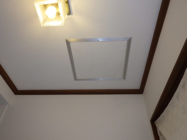上の写真は玄関からすぐのところで、施工のために新たに作った点検口です。