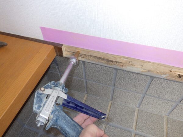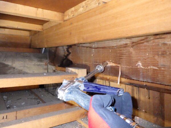 カバーのベニヤ板を外して、木材に直接薬剤を注入しました。