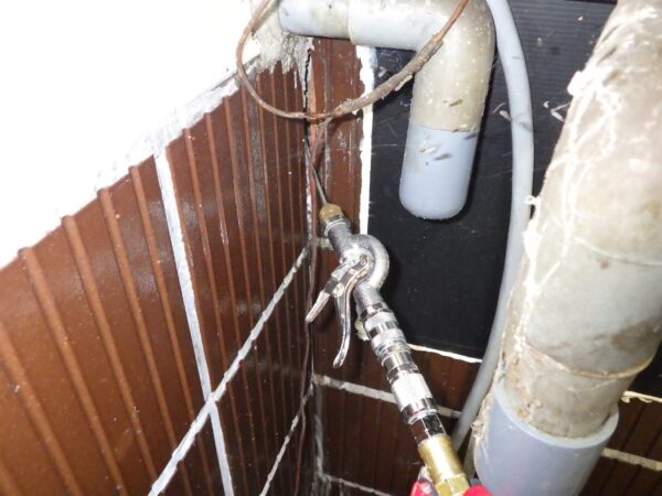 大阪市北区長柄の築50年程の肉屋さんにて、厨房の角のひび割れ部分から羽アリが出てきたとのことで、防蟻処理工事を行いました。